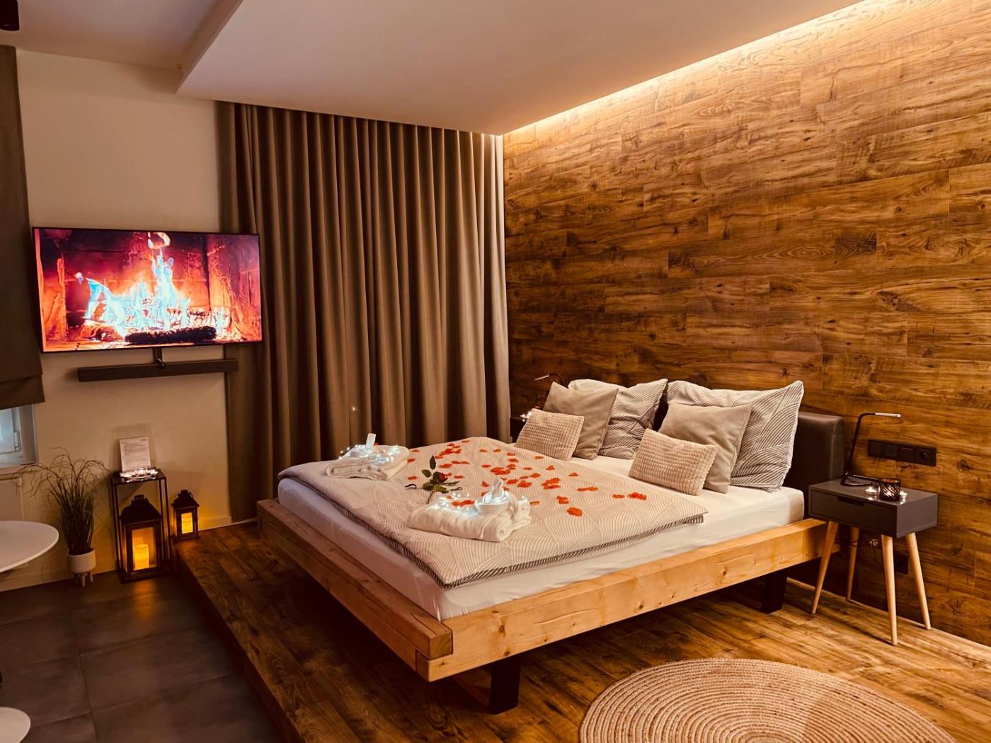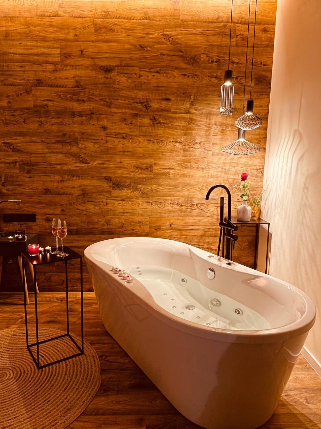Double Room with Sauna and Spa Bath. The spa bath and sauna are the standout features of this double room. In the well-fitted kitchenette, guests will find a stovetop, a refrigerator, kitchenware and a tea and coffee maker. This air-conditioned double room is comprised of a flat-screen TV with streaming services, a private bathroom as well as a balcony with city views. The unit has 1 bed. ;